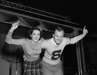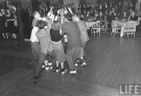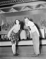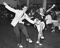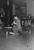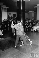 An Arthur Murray troupe pair performing "shag break" while dancing to the music of Benny Goodman's Band in the Madhattan Room in the Hotel Pennsylvania.