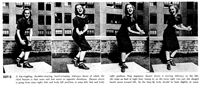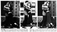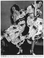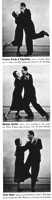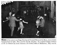 CHARLESTON SWING: One of the three main steps in the Big Apple, this is a violent version of the strenuous Charleston in vogue twelve years ago. Main difference is that in the 1937 adaptation the steps forward and back are taken without the typical Charleston heel turning. First three pictures above show the beginning of the step, i.e., forward on left, kick right foot forward. Last picture shows dancer completing figure by steping back with right and kicking back with left.