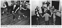 BACK TO CIRCLE SWING/PEELIN' THE APPLE: (left) A Charleston Swing done to the right or left, with backs to center of circle. This is one of the hazardous formations driving the Big Apple from crowded dance floors. (right) Dancers shuffle in a circle right. With fists clenched and together (boy, rear), they lift elbows, open arms, then bring arms forward and sideways (boy, centre front).