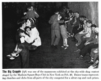 AN INTERCLUB SHAG CONTEST PRODUCES SOME NEW DANCE FORMS: The Big Grapple was one of the maneuvers exhibited at the city-wide shag contest staged by the Madison Square Boys Club in New York on Feb. 23. Dance teams representing churches and clubs from all parts of the city competed for a silver cup and cash prizes.